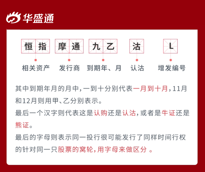 比如 恒指摩通九乙沽D。最前面的两个字--恒指,是相关资产--恒生指数;后面的两个字--摩通,是这只权证的发行商—摩根大通;接下来的两个字,指的是到期年和月,其中年份,九指的是2019年,如果是零就是指2020年。