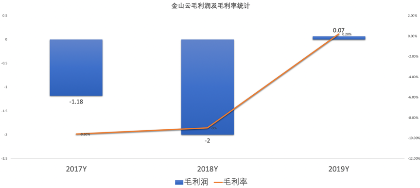 2017-2019年,金山云毛利润分别为-1.18亿元、-2亿元、770万元,对应毛利率分别-9.6%、-9%、0.2%,最终在2019年实现毛利率由负转正。