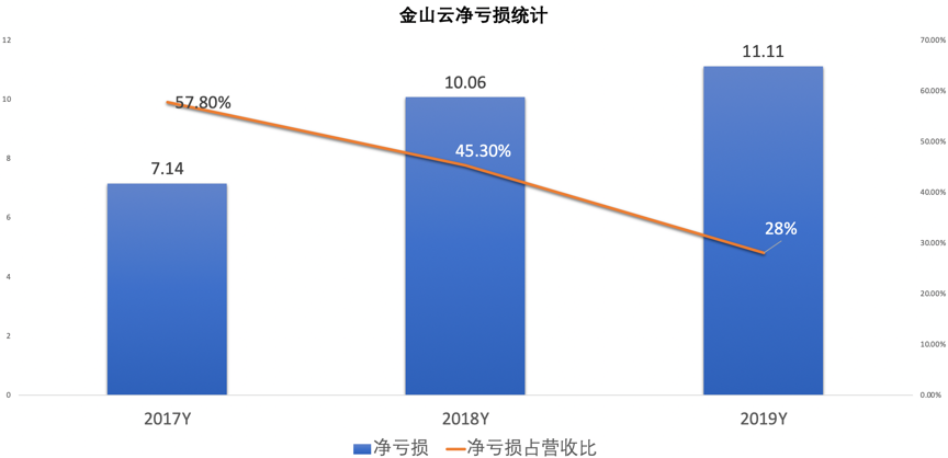 数据显示,从2017年至2019年,金山云在三年内录得净亏损分别为7.14亿元、10.06亿元和11.12亿元,累计亏损28亿元。虽然净亏损持续扩大,但净亏损占营收的比例已经逐渐缩小,高投入期后扭亏为盈,亦在预期之中。