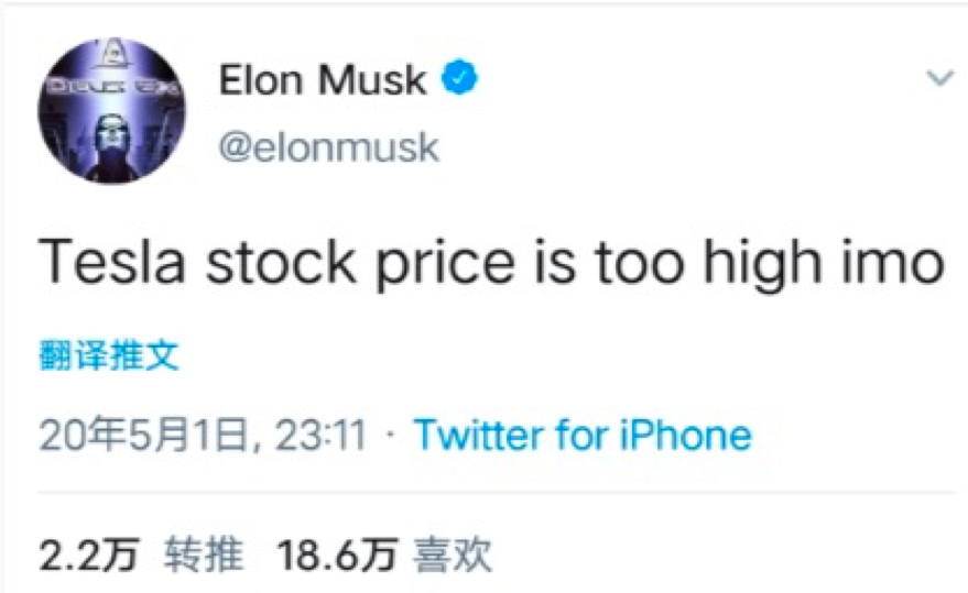 暴跌的原因,一方面是当天美股市场普遍下跌的市场情绪,另一方面则是CEO马斯克突然在Twitter上表示“特斯拉的股价太高了”。