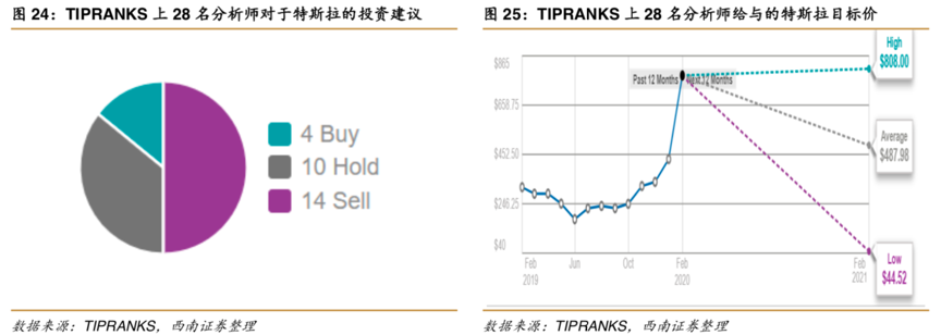从机构对特斯拉的评级看,股价大涨后大部分机构并不看好,其中对特斯拉进行覆盖的分析师中,给予买入评级的比例低于道琼斯平均指数中买入评级的25%,换言之,大多数分析师认为大涨后的特斯拉难以跑赢大市。