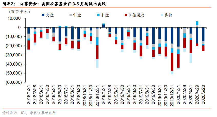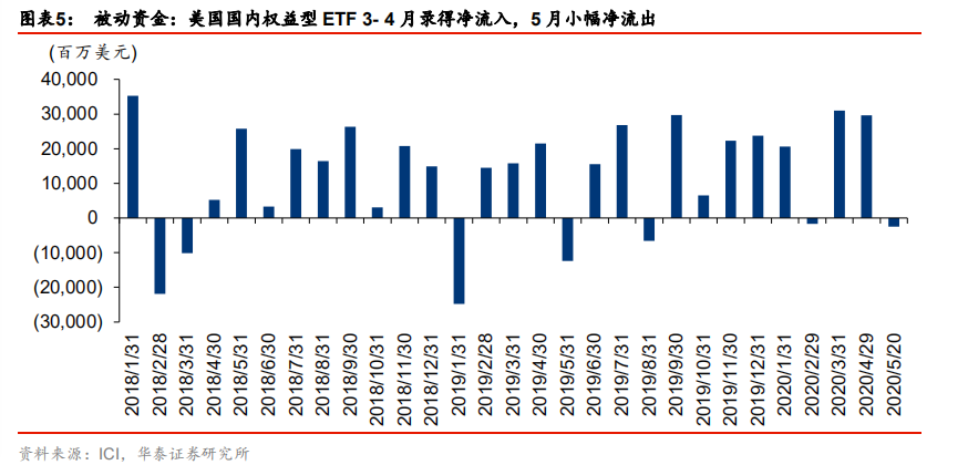 被动资金方面,美国国内权益型 ETF 在今年 3-4 月均录得大幅净申购(3 月:310 亿美元、297 亿美元),5 月小幅净赎回(25 亿美元),反映居民参与此次美股“抄底”的热度较高。此外,美国国内债券型 ETF 继 3 月被大幅赎回后(184 亿美元),4-5 月均录得净申购(4 月:218 亿美元,5 月:192 亿美元),商品型 ETF 在 3-5 月均录得大幅净申购(69亿美元→158 亿美元→48 亿美元)。