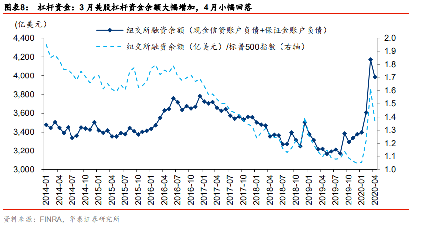 今年3月美股杠杆资金余额大幅攀升,4 月小幅回落。根据 FINRA 披露的融资账户情况,今年 3 月纽交所融资账户余额(信贷账户债务余额+保证金账户债务余额)环比大幅增长(+565亿美元),融资账户余额占标普 500 上市公司市值比重显著增加,4 月融资余额有所回落但仍处于 2014 年以来的高位水平,融资资金的显著攀升或反映杠杆资金积极参与本轮美股“抄底”。