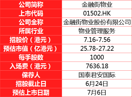 金融街物业发布公告,于2020年6月19日-6月24日招股,公司拟发行9000万股股份,公开发售占10%,国际配售占90%,另有15%超额配股权。每股7.16港元-7.56港元,每手1000股,入场费约7636.18港元,预期将于7月6日上市。