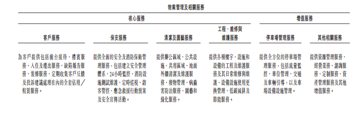 而非商业物业指住宅、公共物业、医院、教育物业及其他。提供的服务内容包括向客户(物业开发商、业主、业主委员会、租户和住户)提供包括客户服务、保安服务、清洁和园艺服务、工程、维修及维护、停车场管理服务等。
