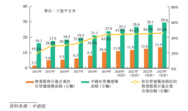 根据中指院的资料,物业服务百强企业在管建筑面积占中国物业管理行业总建筑面积由2014年的19.5%增加至截至2019年12月31日的43.6%。