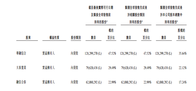 这里值得一提的是,金融街物业还具备国资背景。其主要控股股东有北京市西城区国资委旗下的金融街集团持股35.64%,而中国人寿保险集团旗下国寿不动产持股22.12%,融信合泰(员工持股公司)持股17.24%,上市后公众持股比例将为25%。