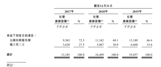 从项目来源来看,来自母集团金融街联属集团的在管建筑面积为1318.9万平方米,在2019年占在管面积的66.4%,独立第三方项目的在管建筑面积670万平方米,占总在管面积的33.6%。而母集团项目贡献收入占比在2019年达到81.1%,第三方为18.9%。