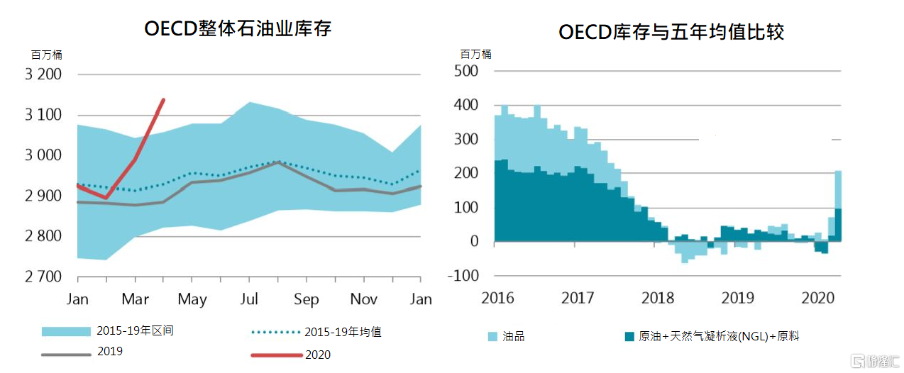 在疫情冲击下,不仅石油库存高企,成品油的库存也处于高位。IEA称,经济合作暨发展组织(OECD)的4月成品油库存数据增长约200万桶/日,达到15.6亿桶;中质馏分油增长最多。