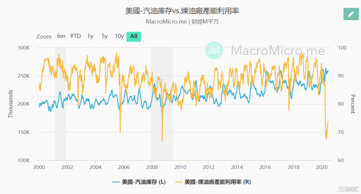根据EIA数据显示,上周美国炼油厂减产,汽油库存减少至2.57亿桶。 然而,库存仍远高于去年同期的2.332亿桶,与4月份刚刚超过2.63亿的纪录高点相差不大。如下图所示,美国的汽油库存依然处于高位,产能利用率的也远低于正常水平。