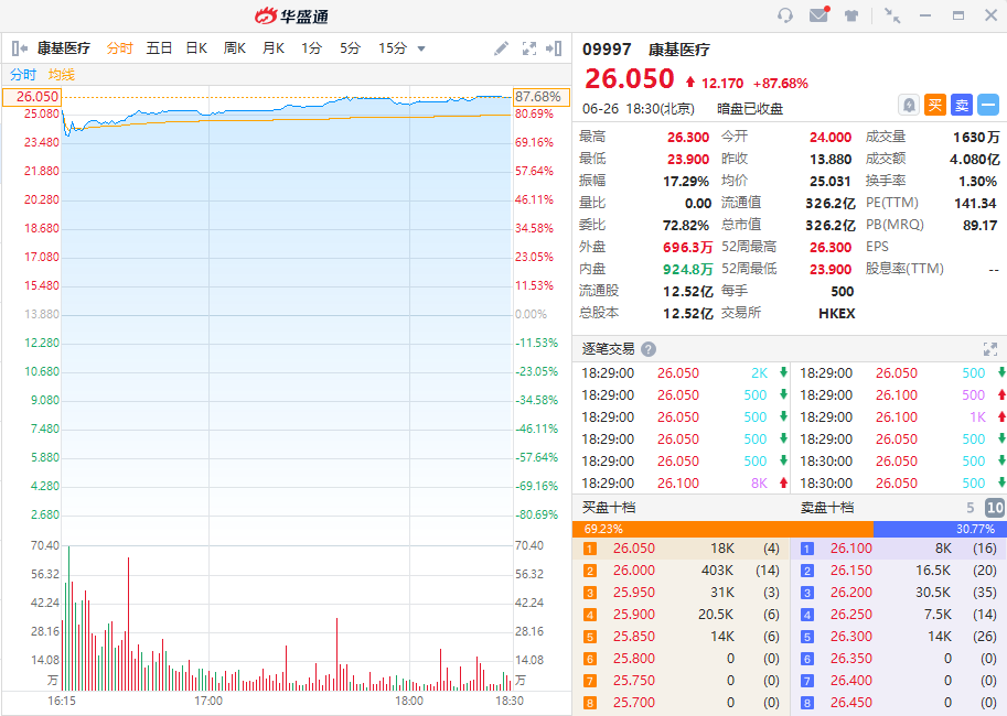 华盛资讯6月26日讯,康基医疗(09997-HK)暗盘收涨87.68%,一手账面盈利6085港元。
