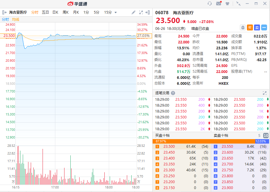 海吉亚医疗(06078-HK)暗盘收涨27.03%,一手账面盈利1000港元。
