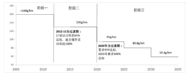 以欧盟为例,2020年1月,欧盟开始执行最严碳排放政策。根据规定,2020年销售新车中的95%,碳排放必须达到95g/km(2019年欧盟平均实际碳排放是122g/km),超出部分每g需要缴纳罚金95欧元。