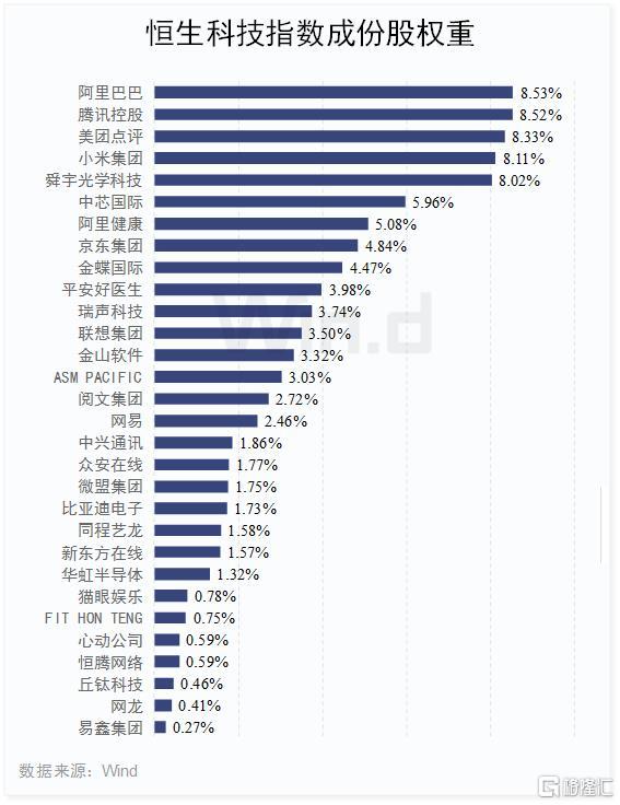 7月20日下午,恒指公司宣布推出恒生科技指数,新指数将会追踪经筛选后的最大30家于香港上市的科技企业。其中包括阿里巴巴、腾讯控股、美团点评、京东等,阿里巴巴权重最高。