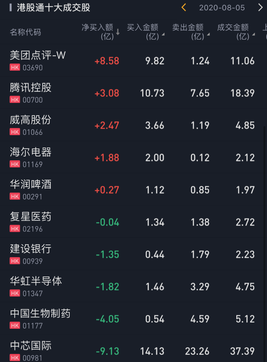 个股方面,今日南下资金净买入美团点评8.58亿港元,净买入腾讯控股3.08亿港元,净买入威高股份2.47亿港元,净买入海尔电器1.88亿港元,净买入华润啤酒0.27亿港元。