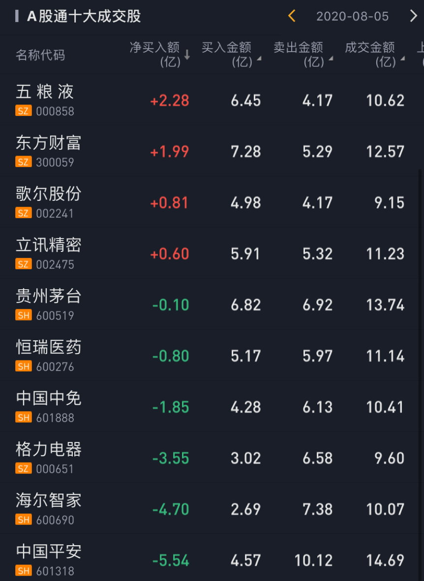 北上资金今日净买入五粮液2.28亿元,净买入东方财富1.99亿元;净卖出中国平安5.54亿元,净卖出海尔智家4.7亿元,净卖出格力电器3.55亿元。