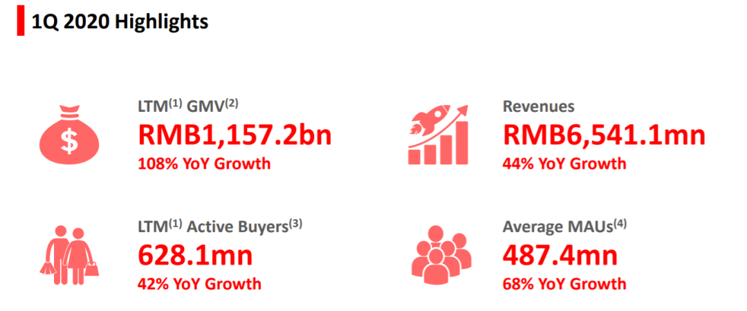 第一个季度,正值中国疫情最为严峻的时候,拼多多 GMV达到11572亿,同比增速达到108%;年度活跃消费者增长42%,月活用户增长达到68%,保持在一个较高的水准。