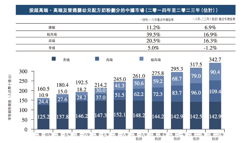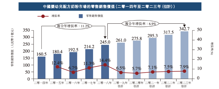 根据弗若斯特沙利文报告,中国婴幼儿配方奶粉市场的零售销售价值从2014年的1605亿元增加至2018年的2450亿元,年复合增长率为11.2%。预计未来中国婴幼儿配方奶粉市场的零售销售价值增长将会放缓,主要原因是出生率下降。