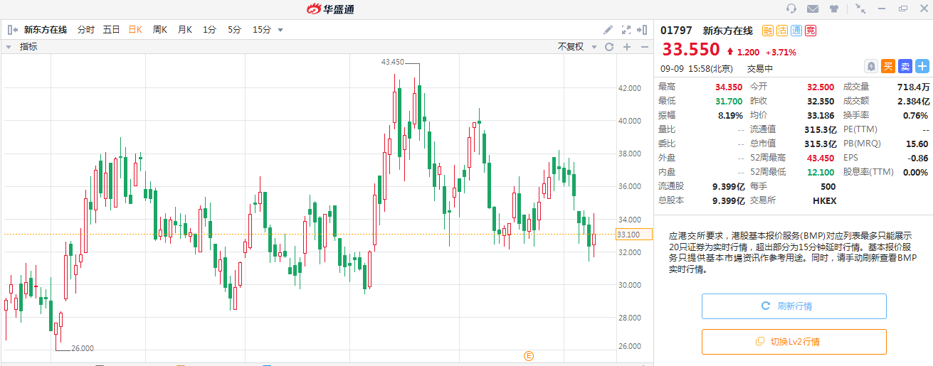 给予新东方在线目标价为43.1港元,相较9月9日收市的33.5港元约有30%上行空间。