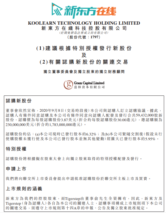 新东方在线于港交所发布正式公告称,2020年9月8日,公司与认购人(新东方及Tigerstep)订立认购协议,据此,公司有条件同意向认购人配发及发行合共5943.2万股新股份,认购价为每股认购股份3.87美元(折合约每股认购股份30.00港元),总认购额为2.3亿美元(折合约17.83亿港元)。(新东方为新东方在线的控股股东,Tigerstep由新东方在线董事俞敏洪全资拥有。)