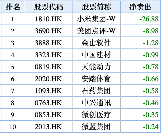 本周,南下资金净卖出小米集团-W26.88亿港元,净卖出额排名第一;净卖出美团点评-W8.98亿港元。此外,南下资金还卖出金山软件1.28亿港元,净卖出中国建材0.99亿港元,净卖出天能动力0.78亿港元。
