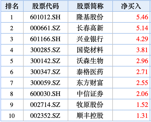 本周北上资金加仓隆基股份、长春高新超5亿元。此外,北上资金还加仓了兴业银行、国瓷材料、沃森生物、泰格医药、东方财富、中信证券等标的。