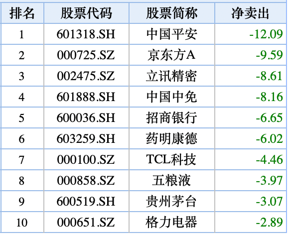 本周北上资金减持最多的标的是中国平安,一周净卖出12.09亿元;净卖出京东方A9.59亿元。此外,北上资金还减持了立讯精密、中国中免、招商银行、药明康德等个股。