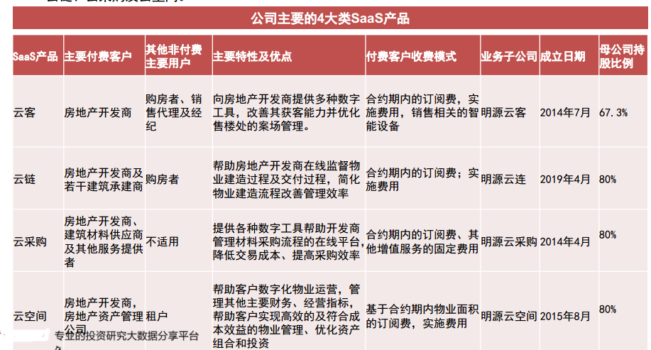 明源云的SaaS产品包括云客、云链、云采购及云空间,可满足房地产开发商、供应商、资产管理公司、房地产运营商以及房地产产业链上的其他产业参与者的各种需求。