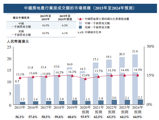在中国城镇化水平不断提高及政府支持的带动下,作为国民经济的一大支柱,预期中国房地产市场未来将持续增长,新房成交额预期于2024年达到约人民币21.6万亿元。