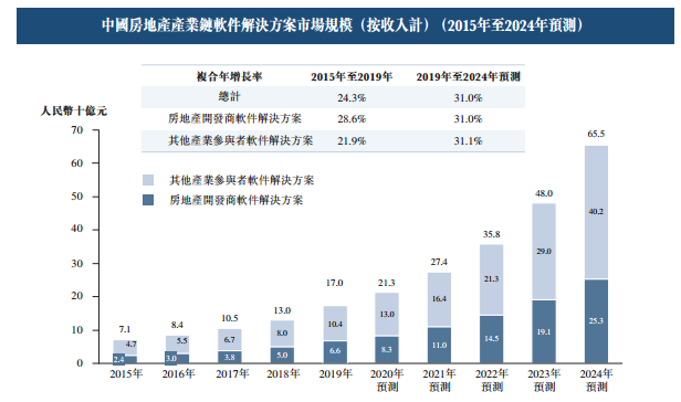 随着房地产开发商及其他产业参与者对数字化转型加深认识、技术进步及市场日渐接纳服务各种应用场景的SaaS产品,中国房地产产业链软件解决方案市场(按收入计)预期将继续快速增长,预期于2024年达致人民币655亿元,2019年至2024年的复合年增长率预计为31.0%。