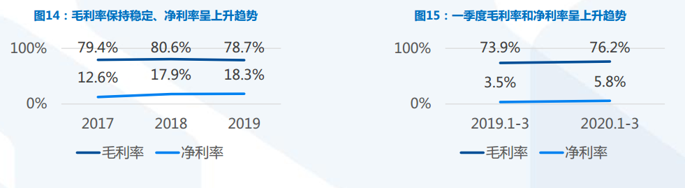 2017-2019年公司毛利率分别为79.4%、80.6%和78.7%,基本保持在稳定的水平;2017-2019年公司的净利率分别为12.6%、17.9%和18.3%,呈上升趋势,但净利润率整体较低。