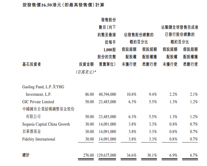 其中,Gaoling Fund, L.P.及YHG Investment, L.P.(高瓴资本) 、GIC Private Limited(新加坡主权基金)、中国国有企业结构调整基金股份有限公司、Sequoia Capital China Growth(红杉资本)、贝莱德基金及Fidelity International(富达基金)分别认购8600万美元、5000万美元、5000万美元、3000万美元、3000万美元及3000万美元。