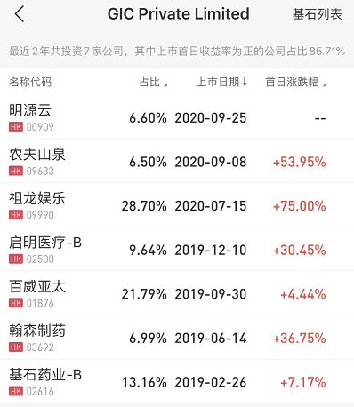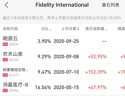 我们通过数据也能看到,明源云的基石机构GIC以及富达基金在近两年做基石的股票,全都上市首日保持上涨,如欧康维视、农夫山泉、沛嘉医疗等首日涨幅还在50%以上。