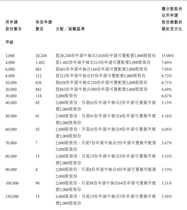 其中,初步提呈发售的公开发售股份获适度超额认购,超购约12.15倍。合共1000万股发售股份(占股份发售项下可供认购的发售股份总数的10%)已由配售重新分配至公开发售,分配予公开发售的发售股份的最终数目增加至2000万股,占根据股份发售可供认购的发售股份总数的20%。共有4759 名公开发行股份的成功申请人。