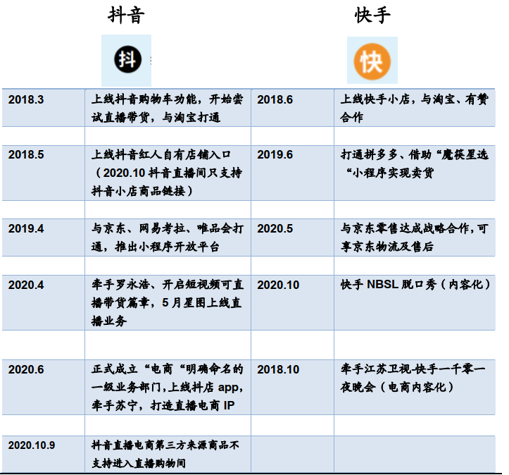 2020年10月, 抖音电商迎来重大改革,直播间不再支持淘宝、京东等第三方商品链接,同时,字节跳动取得合众易宝支付牌照,从用户(日活 6 亿人)、商品(抖音密集拉拢在淘宝、拼多多起家的传统制造产业带, 与当地电商协会合作招商)、支付等环节打通并形成抖音电商闭环。