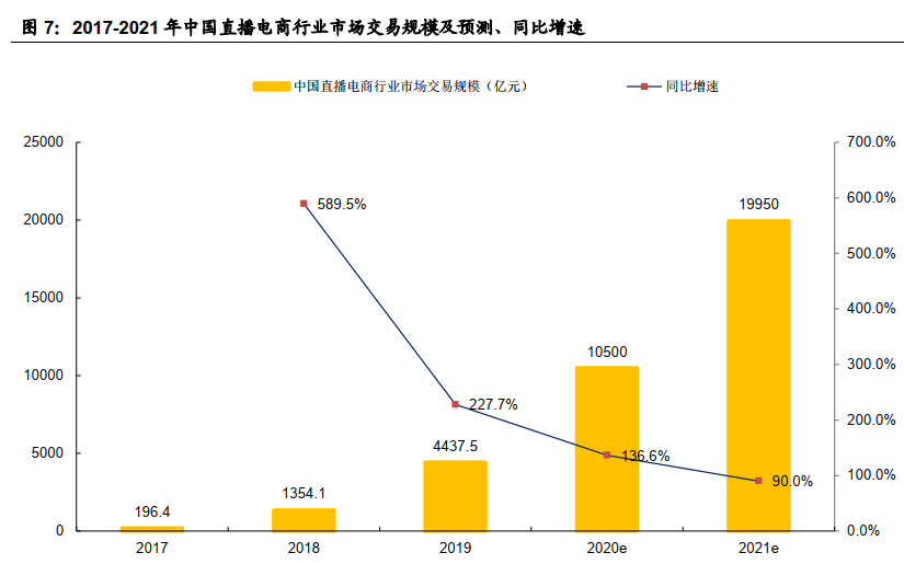 预计2020年中国直播电商在电商市场的渗透率将从2020年的8.6%提升至2021年14.3%,中国直播电商市场交易规模有望从2020年的1.05万亿元增加至2021年的1.995万亿元,增速分别为预计为136.5%、90%。
