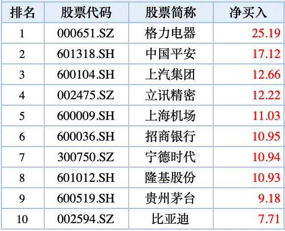 此外,北上资金净买入中国平安17.12亿元;净买入上汽集团、立讯精密超12亿元;净买入上海机场、招商银行、宁德时代、隆基股份超约11亿元。