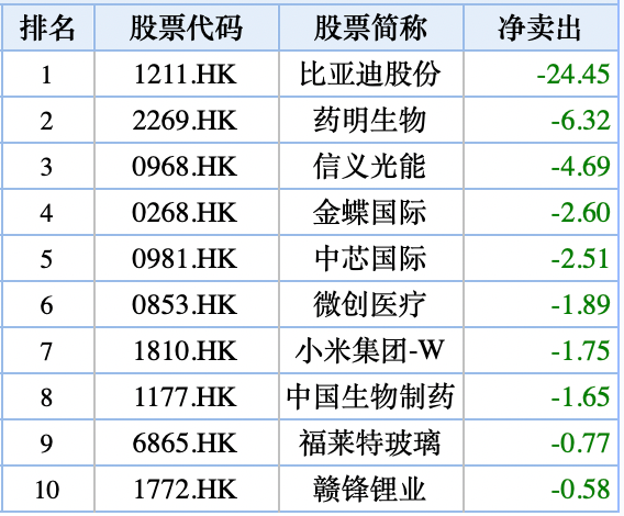 本周,南下资金卖出金额最高的标的为比亚迪股份,一周净卖出24.45亿港元。此外,南下资金还减持了药明生物、信义光能、金蝶国际、中芯国际、微创医疗等个股。
