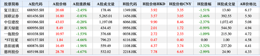 个股方面,复旦张江、国联证券、中信建投、新天绿能、一拖股份等个股仍然位列溢价榜首,投资者可关注相关个股估值回归机会。