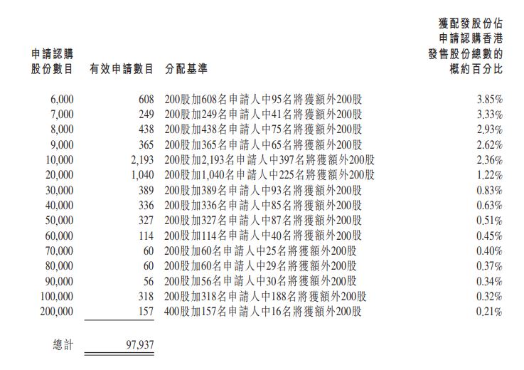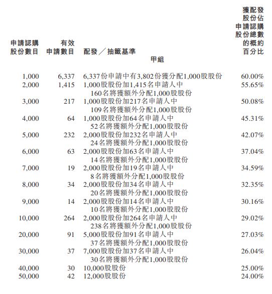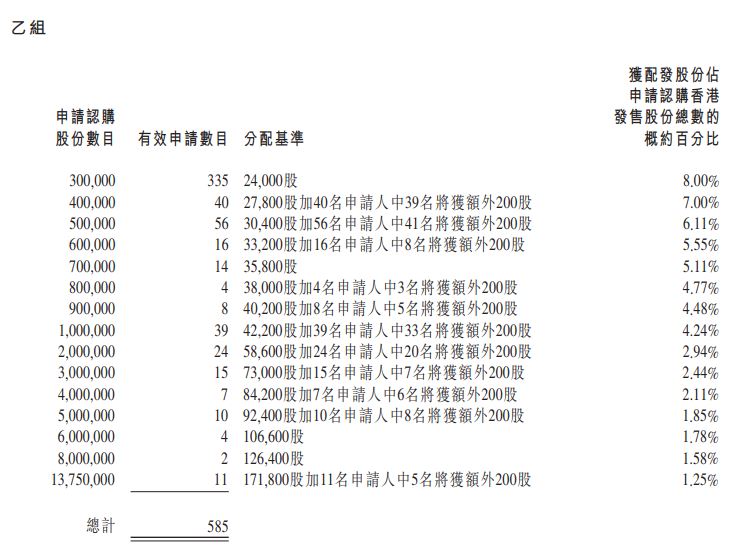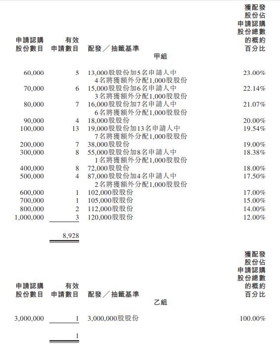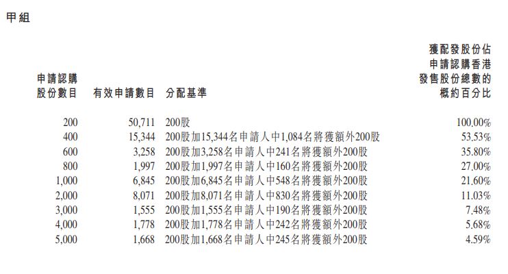 香港公开发售项下初步提呈发售的香港发售股份已获轻微超额认购。接获的有效申请,合共认购4185.3万股香港发售股份,相当于香港公开发售项下初步可供认购香港发售股份总数1500万股的约2.79倍。因此,香港公开发售项下发售股份最终数目为1500万股发售股份,占全球发售项下初步可供认购发售股份总数的10.0%(于任何超额配股权获行使前)。