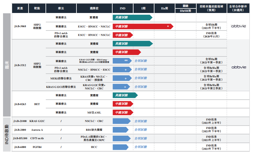 加科思已与AbbVie签订许可及合作协议(「AbbVie协议」),以在全球范围内开发和商业化其SHP2抑制剂,包括JAB-3068和JAB-3312。根据AbbVie协议,加科思于2020年9月行使加科思的中国选择权以在相关地区独家开发和商业化其SHP2抑制剂。