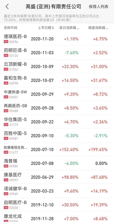 保荐人方面此次加科思的保荐人为高盛,高盛的保荐记录极为靓眼,高盛最近2年共保荐18家公司,其中上市首日收益率为正的公司占比72.20%。