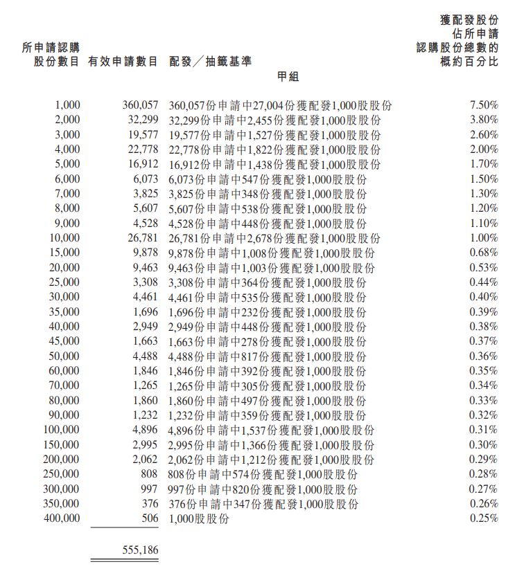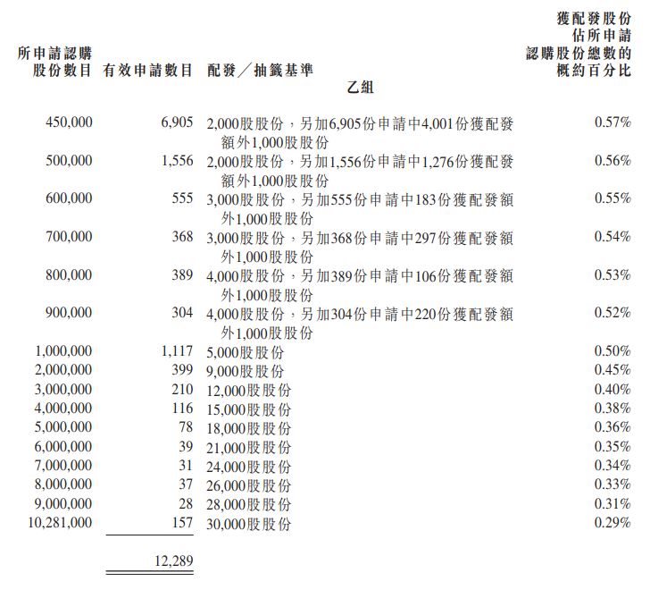 香港公开发售提呈发售的发售股份已获极大幅超额认购。认购合共158.24亿股香港发售股份,相当于香港公开发售项下初步可供认购香港发售股份总数的约769倍以上。香港公开发售项下的发售股份最终数目为1.028亿股股份,相当于全球发售项下初步可供认购发售股份总数的50%(假设超额配售权未获行使)。