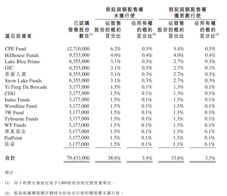 基于发售价每股12.20港元及基石投资协议,基石投资者已认购7943.3万股发售股份,相当于紧随全球发售完成后公司已发行股本约3.4%,及相当于全球发售项下发售股份数目约38.6%(假设超额配售权未获行使)。