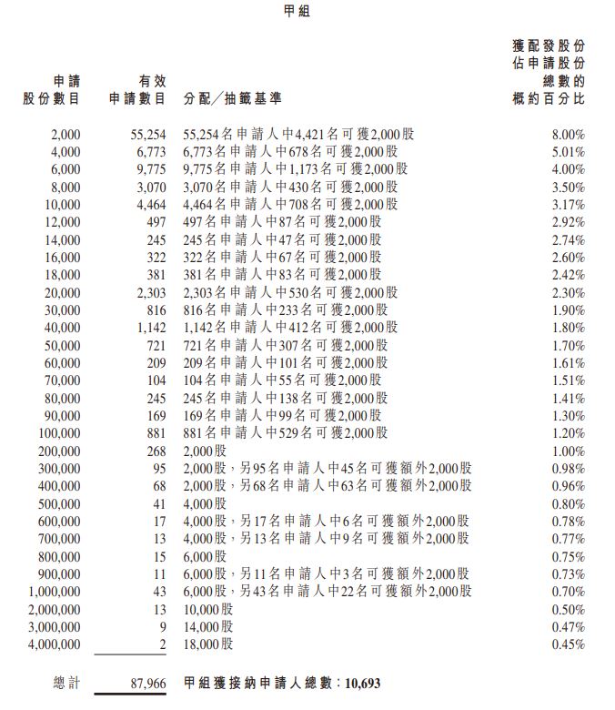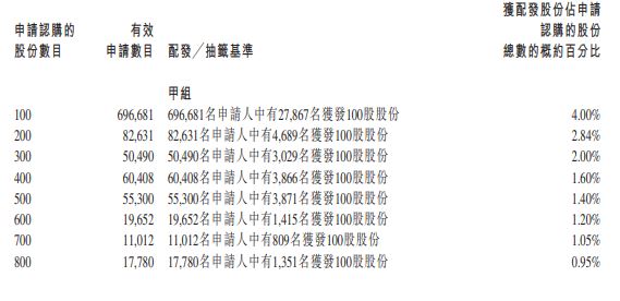 根据香港公开发售初步提呈发售的香港发售股份获大幅超额认购,相当于香港公开发售初步可供认购香港发售股份总数约1204.16倍。香港公开发售的发售股份最终数目已增至2191.32万股发售股份,占全球发售初步可供认购的发售股份总数约6.0%(未行使超额配股权),并已分配予香港公开发售的174040名成功申请人。