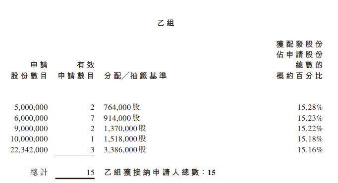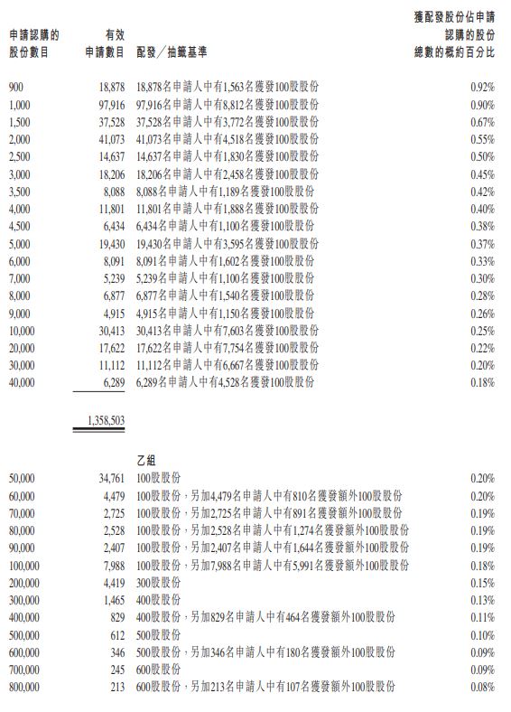 公开发售一手中签率8%,申购100手稳获一手,乙头获配382手。