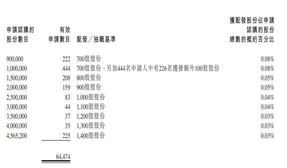 根据公开发售初步提呈发售的发售股份已获轻微超额认购。合共接获87981份根据公开发售提出的有效申请,认购合共10.039亿股发售股份,相当于根据公开发售初步可供认购的发售股份总数约22.47倍。