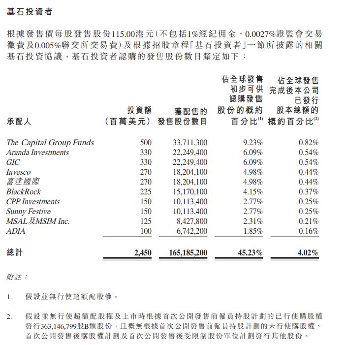 根据发售价每股发售股份115.00港元及基石投资协议,基石投资者认购合共1.65亿股发售股份,相当于公司紧随全球发售完成后已发行股本约4.02%(假设并无行使超额配股权及上市时根据首次公开发售前雇员持股计划的已行使购股权发行3.63亿股B类股份,且概无根据首次公开发售前雇员持股计划的未行使购股权、首次公开发售后购股权计划及首次公开发售后受限制股份单位计划发行其他股份);及全球发售的发售股份数目45.23%(在各情况下均假设并无行使超额配股权)。