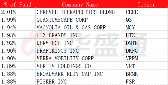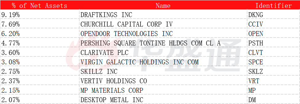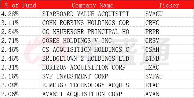 如下图所示,SPCX的前十大持仓占总持仓的26%。这是由于新发行的SPAC数量较大,令SPCX投资仓位进一步分散。