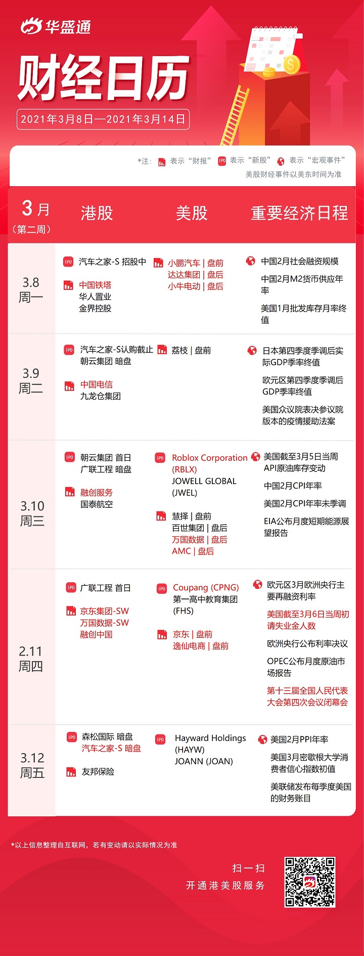 美股新股方面,本周有6家公司挂牌上市,包括沙盒游戏平台Roblox Corporation(RBLX)、韩国电商Coupang(CPNG)、第一高中教育集团(FHS)、泳池设备制造商Hayward Holdings(HAYW)、面料和手工艺品零售商JOANN(JOAN)、隆力奇旗下聚好商城(JWEL)。